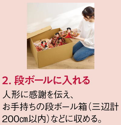 供養をするお人形に感謝を伝え、お手持ちの段ボール箱(三辺計200cm以内、お人形などを全て入れた状態で重量30kg以内)などに収めてください。